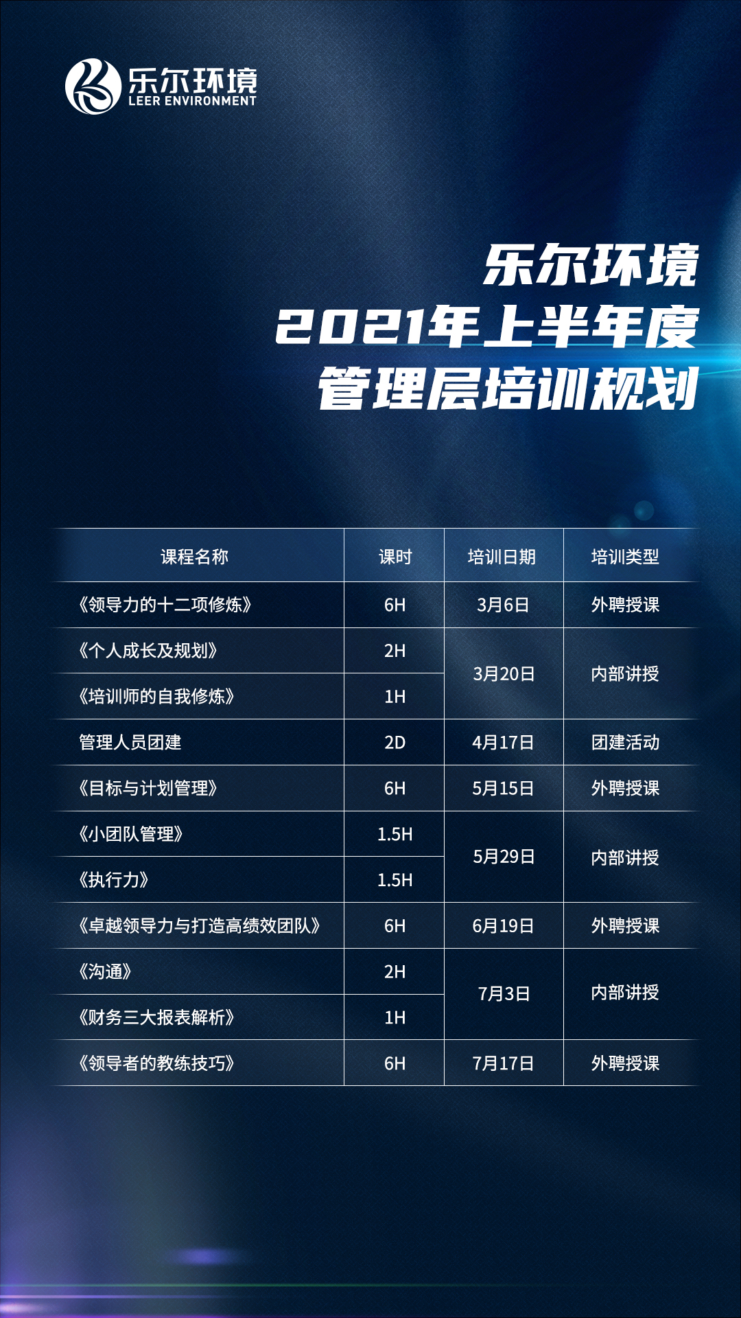 乐尔环境2021年上半年度管理层培训规划安排如下: