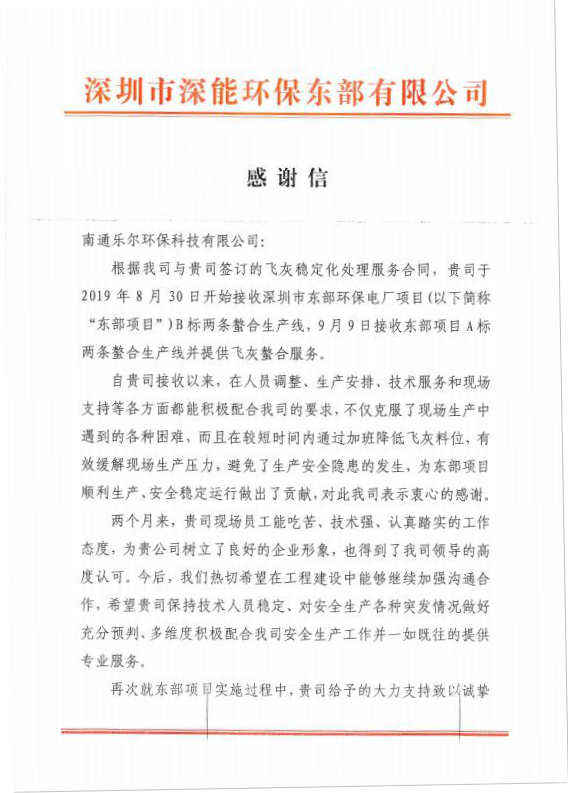 乐尔环境自接收深能源东部电厂飞灰螯合生产线以来,在人员调整、生产安排、技术服务和现场支持中都积极配合客户的需求,克服现场生产中遇到的各种困难,并在较短时间内通过加班降低飞灰料位,有效缓解现场生产压力,避免了生产安全隐患的发生,为东部项目顺利生产、安全稳定运行做出了贡献,对此深能源东部电厂对乐尔环境予以表扬并表示感谢。