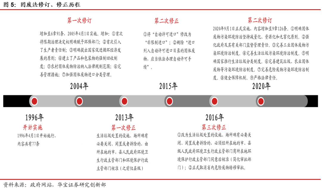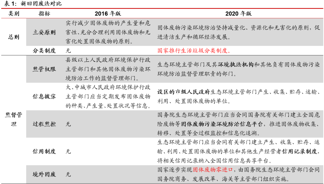 新固废法将于9月正式实施,推动固废全产业链发展。第十三届全国人民代表大会常务委员会第十七次会议于2020年4月29日修订通过《中华人民共和国固体废物污染环境防治法》(简称新固废法),自2020年9月1日正式实施。我国固废法于1996年4月1日正式实施,2004年进行了第一次修订,引入生产者责任制,2013年、2015年、2016年先后进行了三次修正,本次是固废法时隔15年的第二次修订。本次修订版内容由原先的六章91条增加至九章126条,2020年修订版在2016年版的基础上,细化工业固体废物、生活垃圾、危险废物的相关规定,新增建筑垃圾、农业固体废物及保障措施的相关内容。新固废法对固体废物产生、收集、贮存、运输、利用、处置全过程提出更高的防治要求,将进一步带动固废行业的稳健可持续发展。
